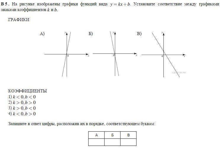 На рисунке изображены графики функций вида . Установите соответствие между графиками и знаками коэффициентов k и b