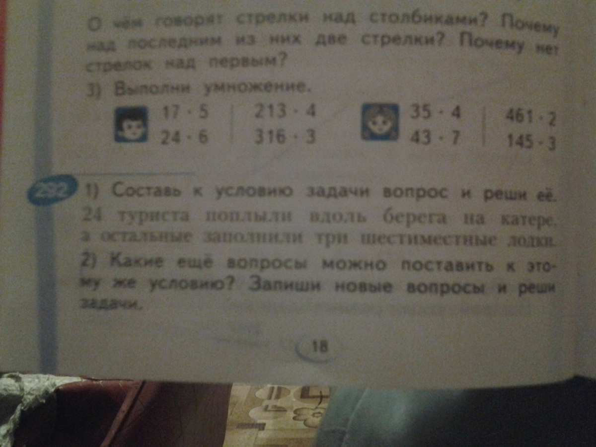 если нужны вопросы то можно задать такие 1) сколько туристов было в лодках?Решение 3*6=18туристов. 2) На сколько больше туристов катере чем в лодках? Решение 3*6=18 тур. 24-18=6тур. ответ на 6 туристов больше в катере.