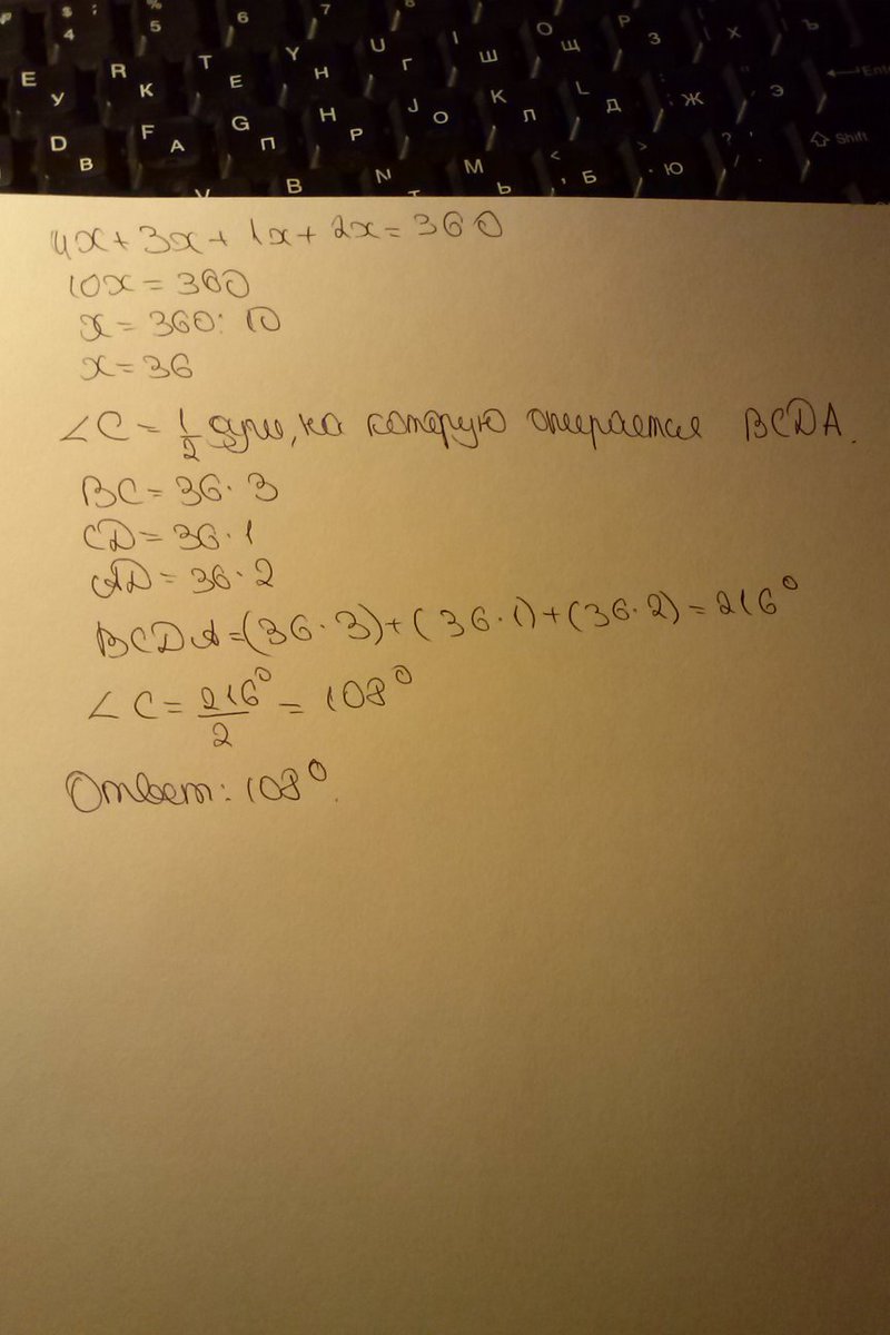 Точки A B C D,РАСПОЛОЖЕННЫЕ НА ОКРУЖНОСТИ,ДЕЛЯТ ЭТУ ОКРУЖНОСТЬ НА ЧЕТЫРЕ ДУГИ:АВ ВС СD АD,ГРАДУСНЫЕ ВЕЛЕЧИНЫ КОТОРЫХ ОТНОСЯТСЯ СООТВЕТСТВЕННО КАК 4:3:1:2.нАЙДИТЕ ГРАДУСНУЮ МЕРУ УГЛА С ЧЕТЫРЕХУГОЛЬНИКА ABCD