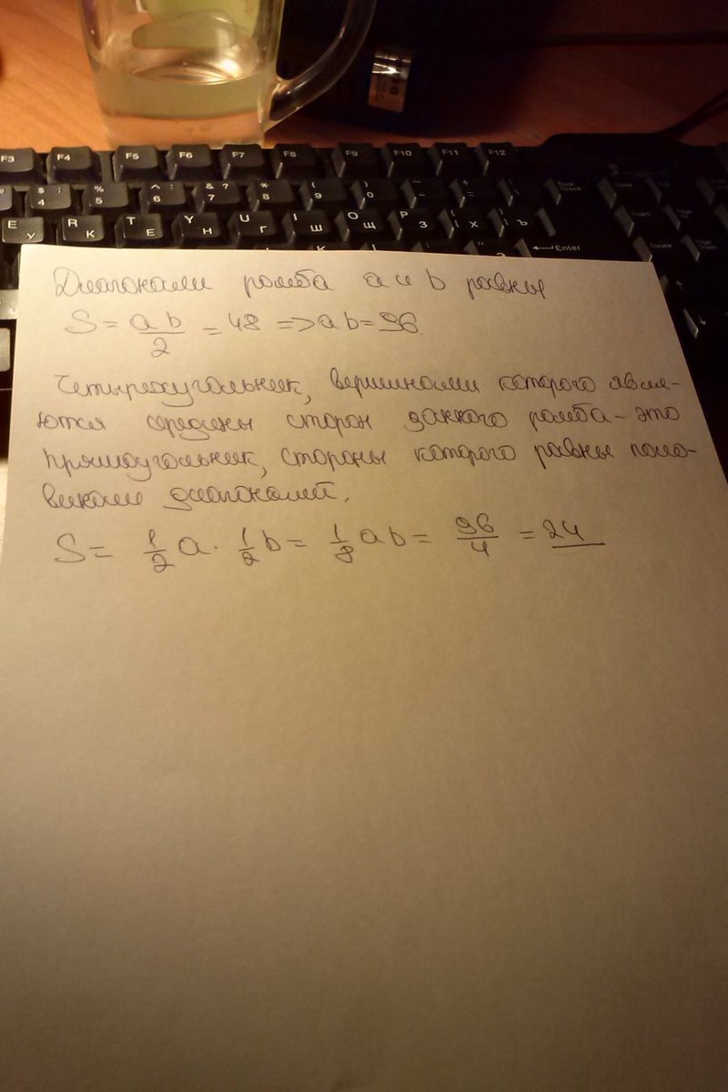 площадь ромба 48 кв см.найдите площадь ромба четырех вершин которых является середины сторон данного ромба