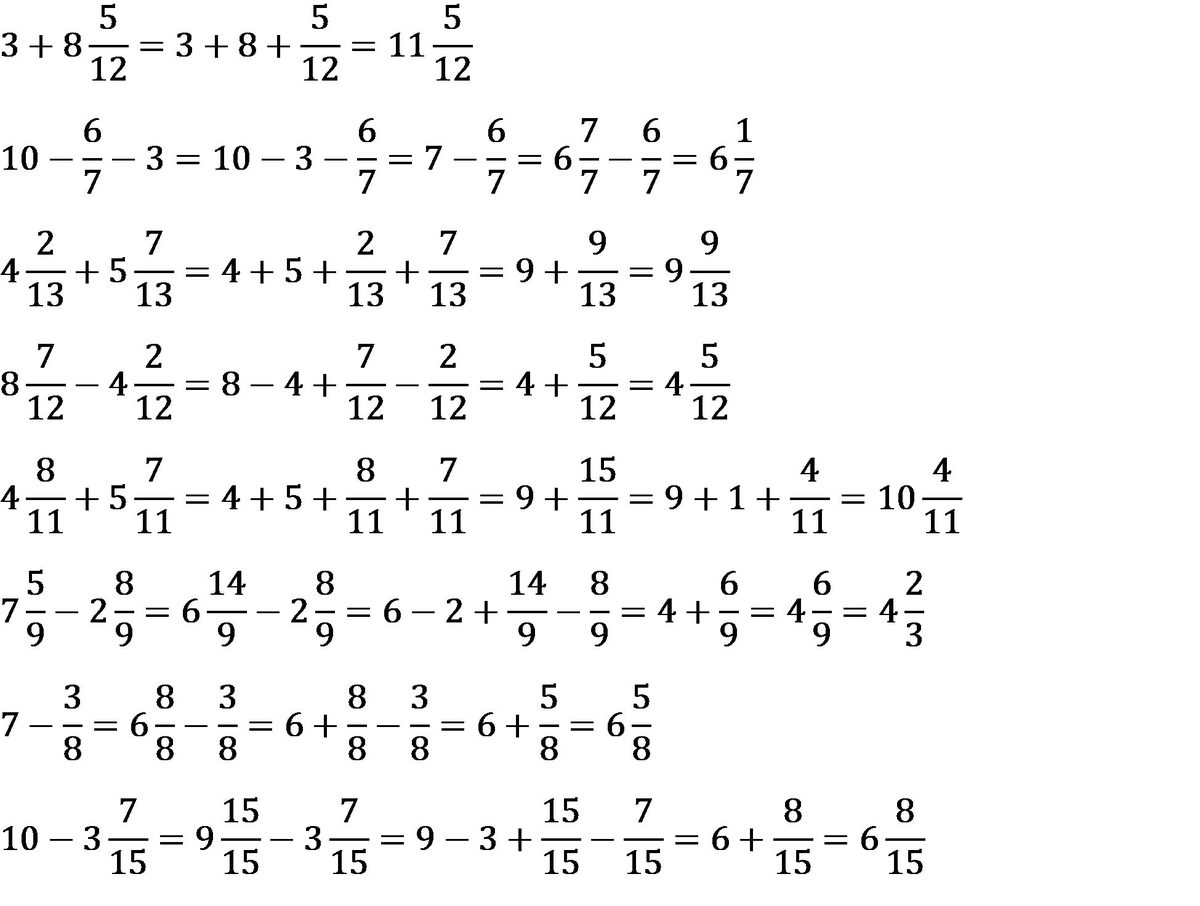 В) 4 2/13 + 5 7/13; Ж) 7 - 3/8