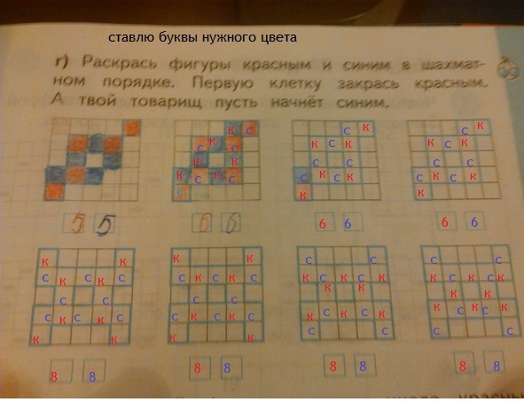 Раскрась фигуры красным и синим в шахматном порядке первую клетку закрась красным а твой товарищ пусть начнет синим.