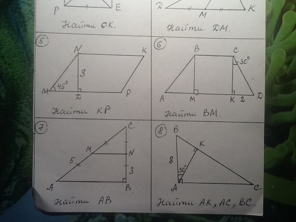 8. Уже писала что против угла в 30 градусов лежит катет в два раза меньше гипотенузы (запомни это!) значит ВК=82=4