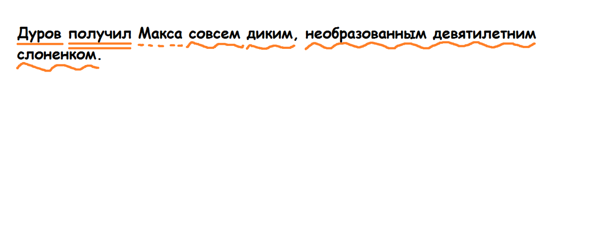 Синтаксический разбор предложения: Дуров получил Макса совсем диким, необразованным девятилетним слоненком.