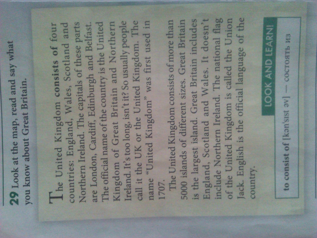 Великобритания состоит из более 5000 островов разных размеров. Великобритания включает в себя Англию. Шотландию и Уэльс. И не включает в состав Северную Ирландию. Национальный флаг Соединенного Королевства называют "Юнион Джек". Английский является официальным языком страны.