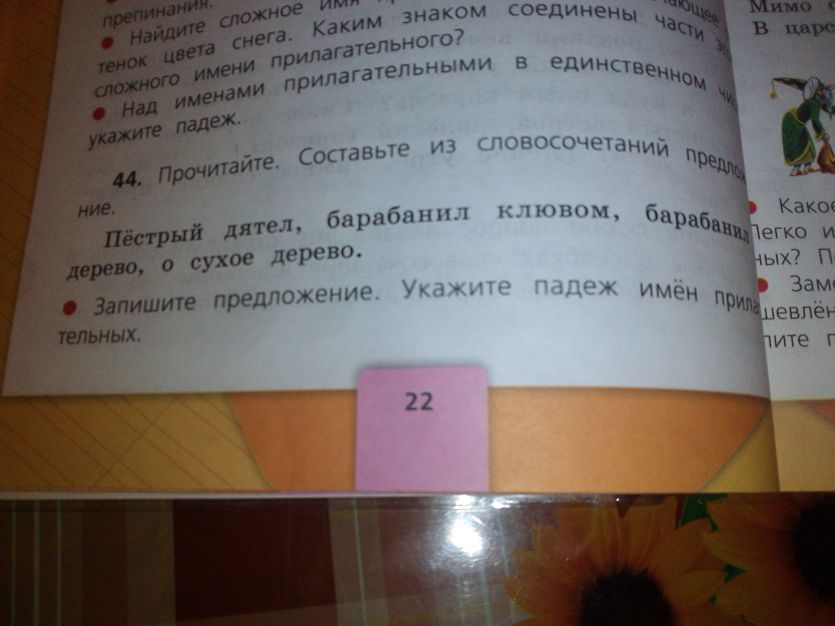 Прочитайте.Составьте из словосочетаний предложение. Пестрый дятел, барабанил клювом, барабанил о дерево , о сухое дерево. Запишите предложение .Укажите падеж имён прилагательных.