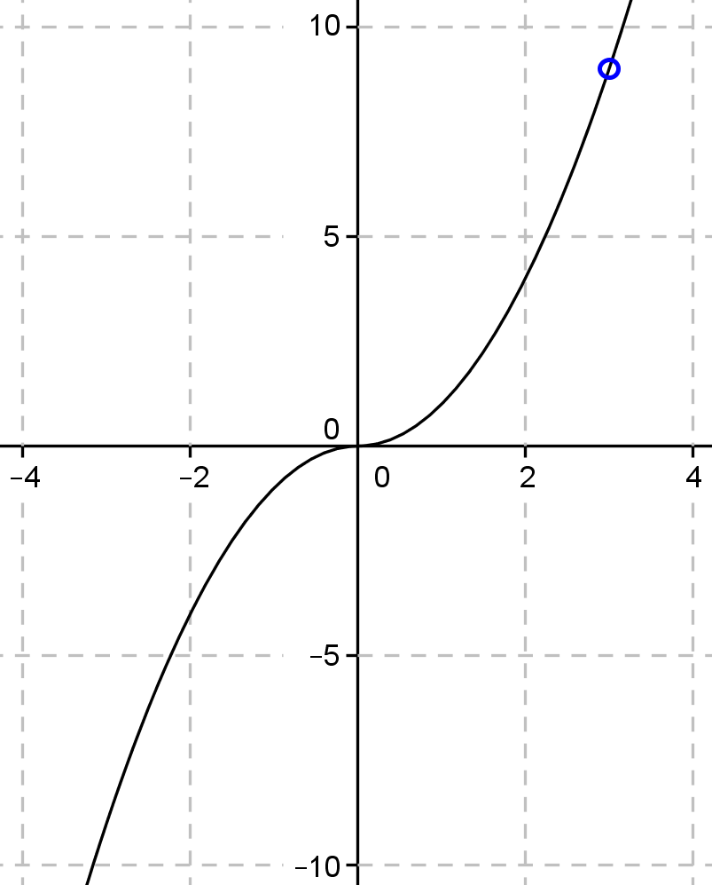 Функция принимает все действительные значения кроме выколотого y = 9 при x = 3.