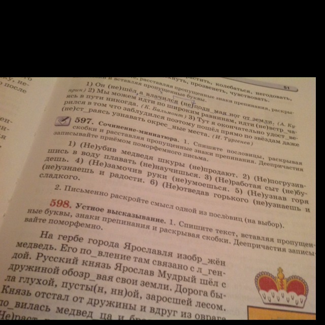 Спишите пословицы,раскрывая скобки и расставляя пропущенные знаки препинания.Деепричастия записывайте приёмом поморфемного письма.Упр.597