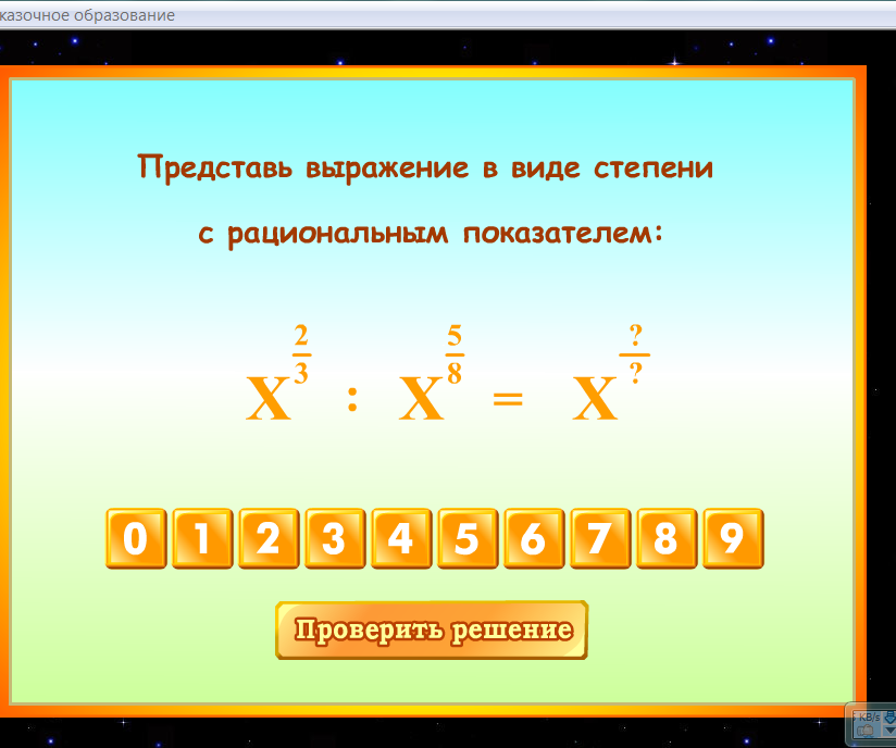 х(в степени 2/3):х(в степени5/8)=х(в степени 23 - 58)=х(в степени 1/24)