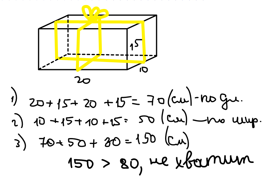чтобы обвязать коробку с такими параметрами надо ленту длиной 150 см :(20 х 2 +10 х 2 +15 х 4 +30 =150 см