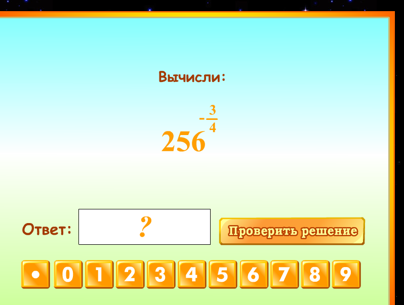 256 в -34 степени равно 1(корень 4 степени из 256 в 3 степени ) =164