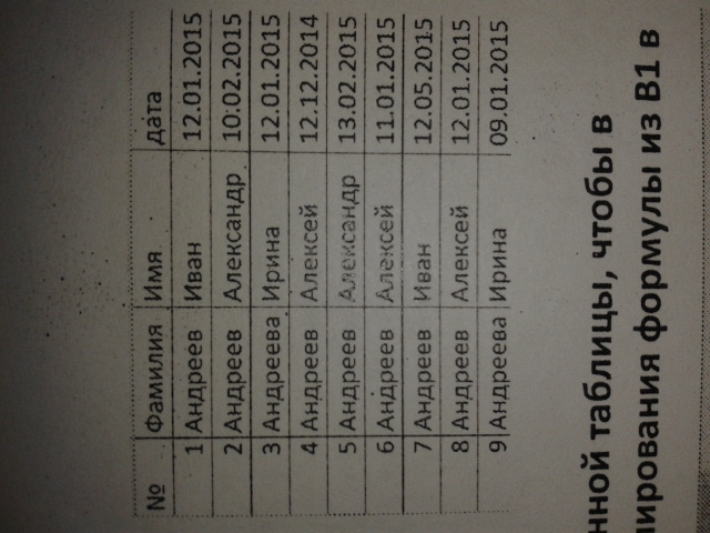 таблицу, отсортировали сначала по фамилиям, потом по дате. в результате запись, находящаяся под номером 8 сместилась на строку под номером...
