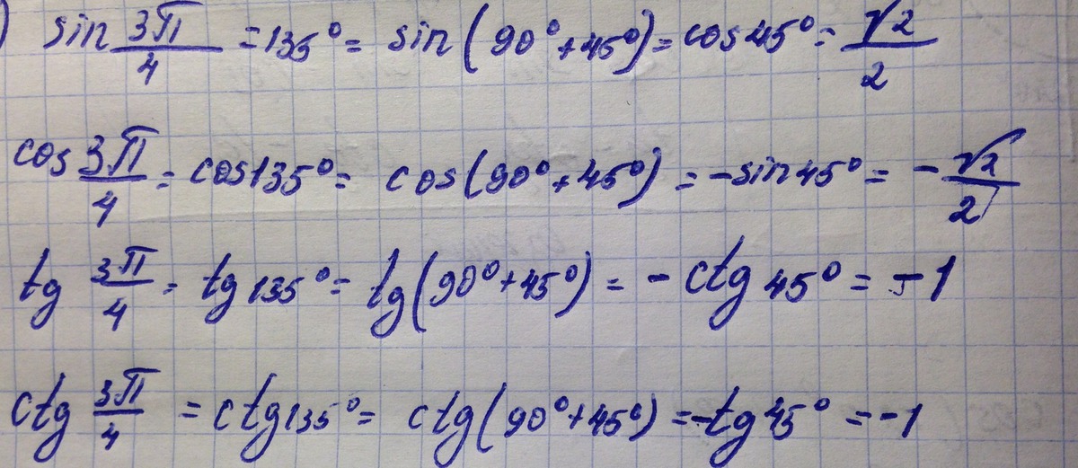 Например во втором примере: косинус 135 ты разбила на косинус(90+45). В скобках слагаемое 90, значит по формуле приведения функция меняется на кофункцию. А знак определяем по углу прежней функции. Угол 90+45 лежит во 2 четверти. Косинус во 2 четверти отрицательный, значит получается -синус45.