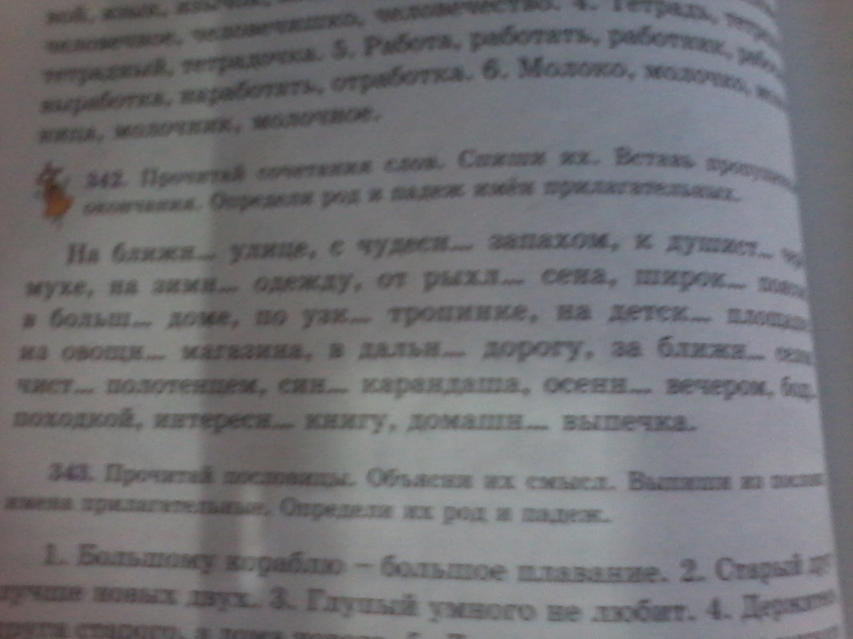 На ближней (ж.р., предл.п.) улице, с чудесным( м.р., твор.п.) запахом, к душистой(ж.р.дат.п.) черёмухе, на зимнюю(ж.р.,вин.п.) одежду, от рыхлого(м.р.,род.п.) сена, - дальше я не разобрала, искажённое фото -, в большом(м.р., предл.п.) доме, по узкой(жр.,дат.п.) тропинке, на детской(ж.р.,предл.п.) площадке, из овощного(м.р.,род.п.) магазина, в дальнюю(ж.р.,вин.п.) дорогу, за ближним(м.р.,твор.п.) селом, с чистым(м.р.,твор.п.) полотенцем, синего(м.р.,род.п.) карандаша, осенним(м.р.,твор.п.) вечером, бодрой(ж.р.,твор.п.) походкой, интересную(ж.р.,вин.п.) книгу, домашняя(ж.р., может стоять как в имен.п, так и винит.п!!!, зависит от синтаксической роли слова " выпечка ", к которому относится это прилагательное) выпечка.