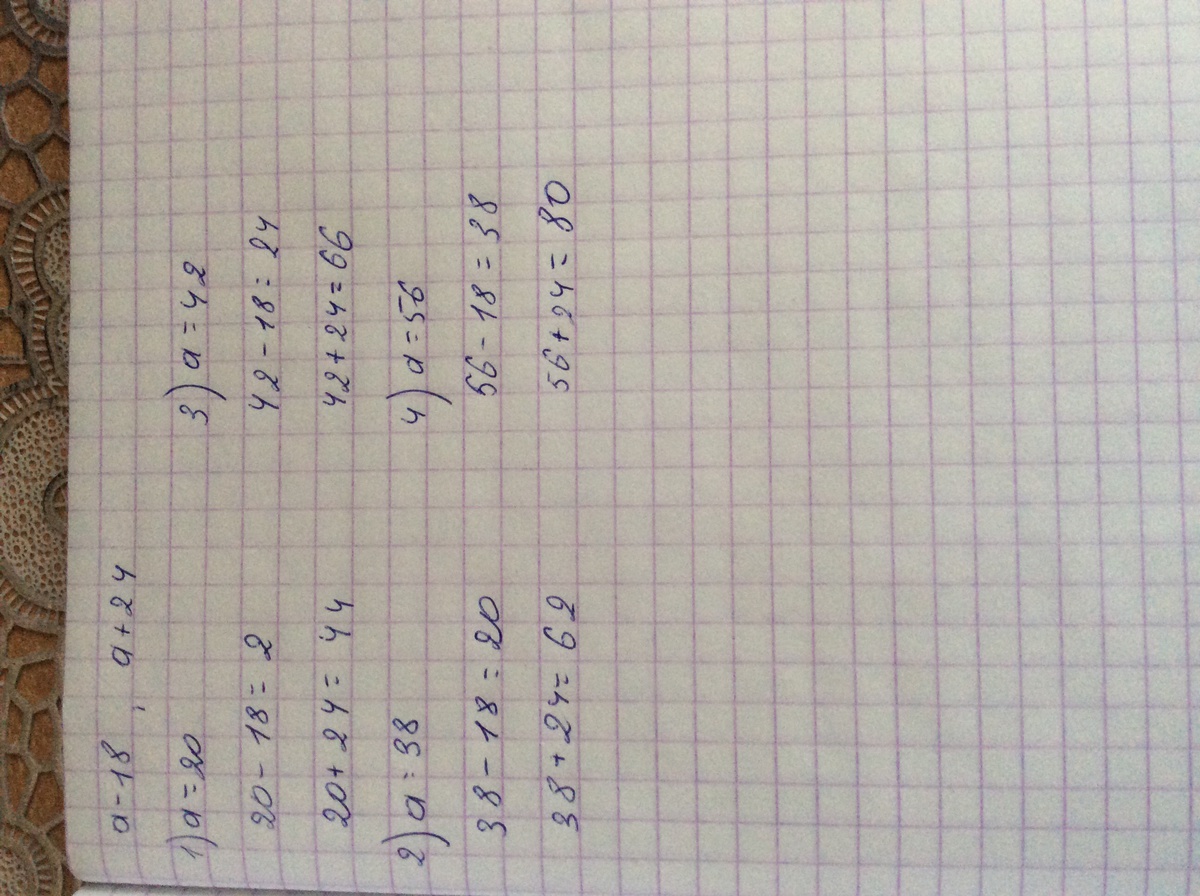Найдите значение выражения а - 18 и а+ 24 при a = 20, a = 38, а =42, и а=56.