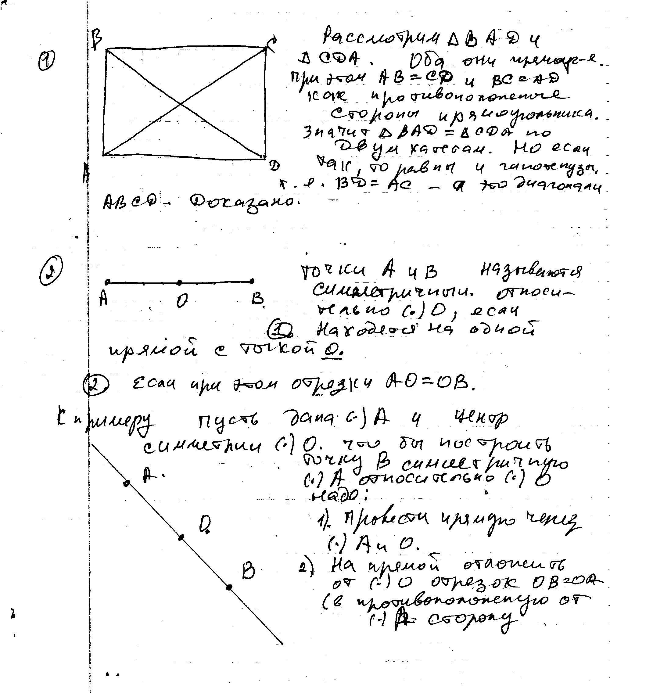 1. Докажите что диагонали прямоугольника равны. 2.Какие две точки называются симметричными относительно данной точки?