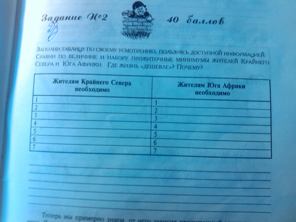 Жителям Крайнего севера необходимо – досрочная пенсия, льготные земли под жилье, употребление мясной пищи и фруктов, разведение оленей.Жителям юга Африки необходимо – улучшить систему образования, вернуть национальные богатства, развивать туризм, укрепить правящую власть.