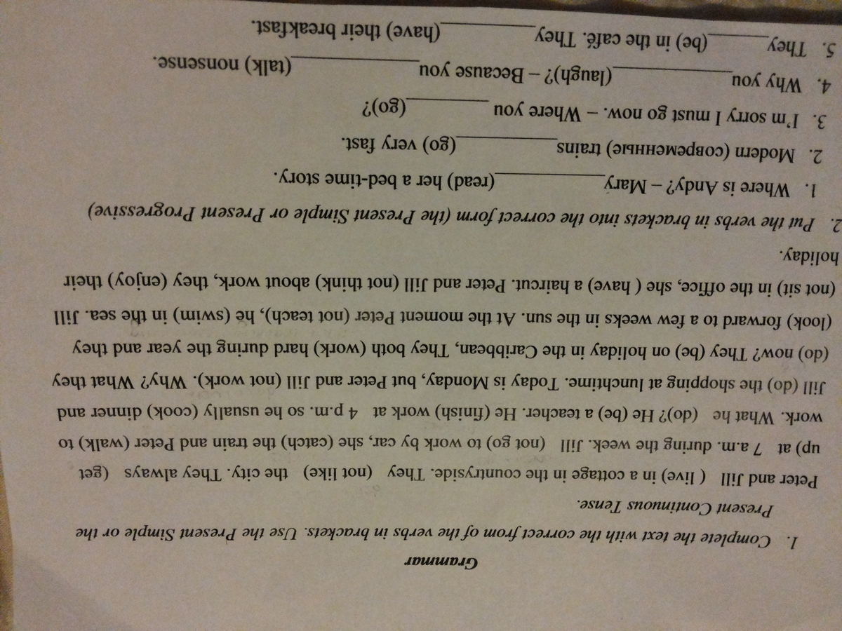 1.Peter and Jill live in a cottage in the countryside. They don't like the city. They always get up at 7 a.m. during the week. Jill doesn't go to work by car, she is catching the train and Peter is walking to work. What is he doing ? He is a teacher. He finishes work at 4pm so he usually cooks dinner and Jill does the shopping at lunchtime. Today is Monday, but Peter and Jill are not working. Why? What are they doing now? They are on Holiday in the Caribbean. They both are working hard during the year and they look forward to a few weeks in the sun. At the moment Peter is not teaching , he is swimming in the sea. Jill is not sitting in the office, she is having a haircut. Peter and Jill don't think about work , they are enjoying their holiday.