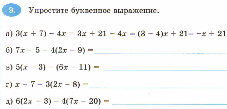 в) 5(х - 3) - (6х - 11) = 5х - 15 - 6х + 11 = -х -5