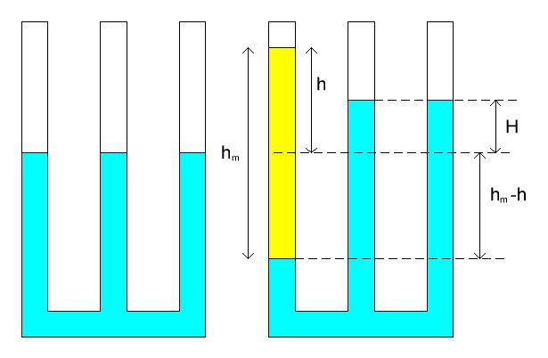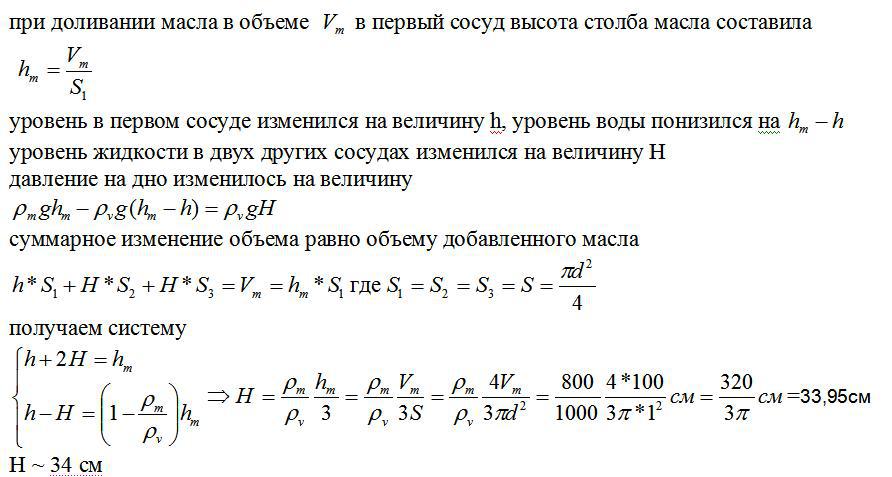 Колена сообщающихся сосудов представляют собой три одинаковые вертикально расположенные трубки диаметром d = 1 см каждая. Трубки частично заполнены водой. В одну из трубок заливают масло объёмом Vм =100 см3, при этом масло не перелилось в другие трубки. На сколько повысится уровень воды в остальных трубках? Плотность масла ρ1 =800 кг/м3, плотность воды ρ2 =1000 кг/м3.