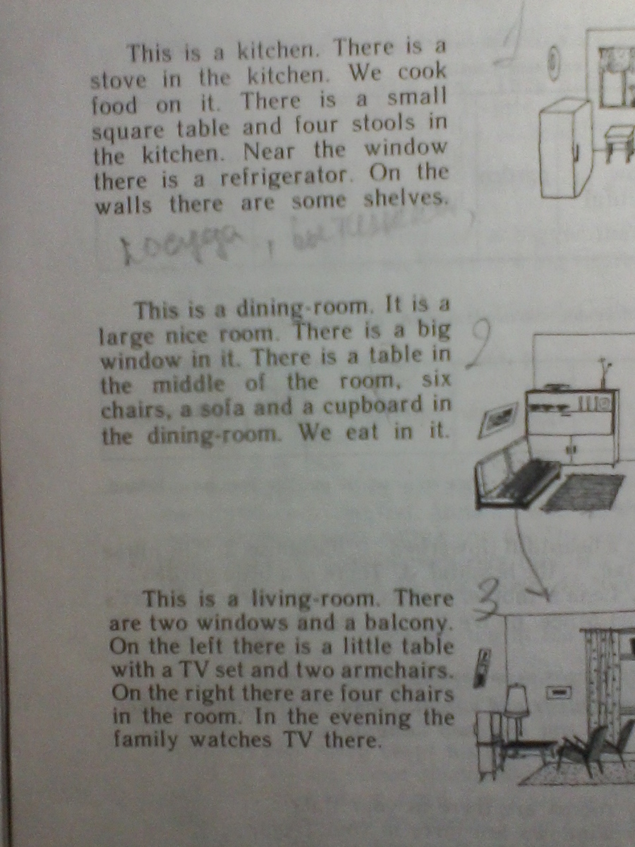 Это столовая. Это большая красивая комната. В ней есть большое окно. По среди столовой стоят стол, также есть шесть стульев, диван и буфет. Здесь мы кушаем.