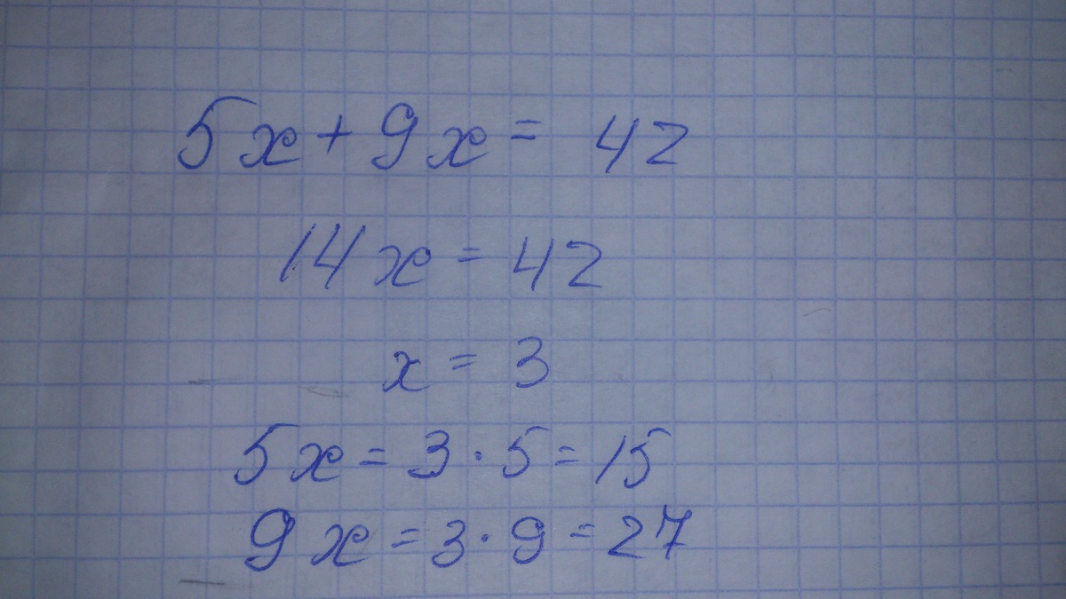 В саду растут вишнёвые и грушевые деревья. Число вишнёвых деревьев относится к числу грушевых деревьев как 5:9.Сколько в этом саду грушевых деревьев,если в нём всего 42 дерева???