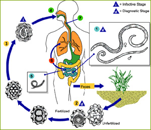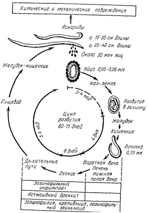 яйцо аскариды попадает через грязные руки в рот, проглатывается попадает в кишечние, сбрасывает оболачку и из яйца выходит личинка. Она пробуривается через стенку кишечника пробираясь в печень.Через печень попадает в нижнию воротную вену и вместе с токои крови попадает в легкие.Надышавшись кислородом личинка пробуривается через альвеолы и бронхи и попадает в гортань. Человек откашливается и вновь проглытывает личинкуюОна опять попадает в кушечник и теперь уже развивается взрослая особь способная к размножению