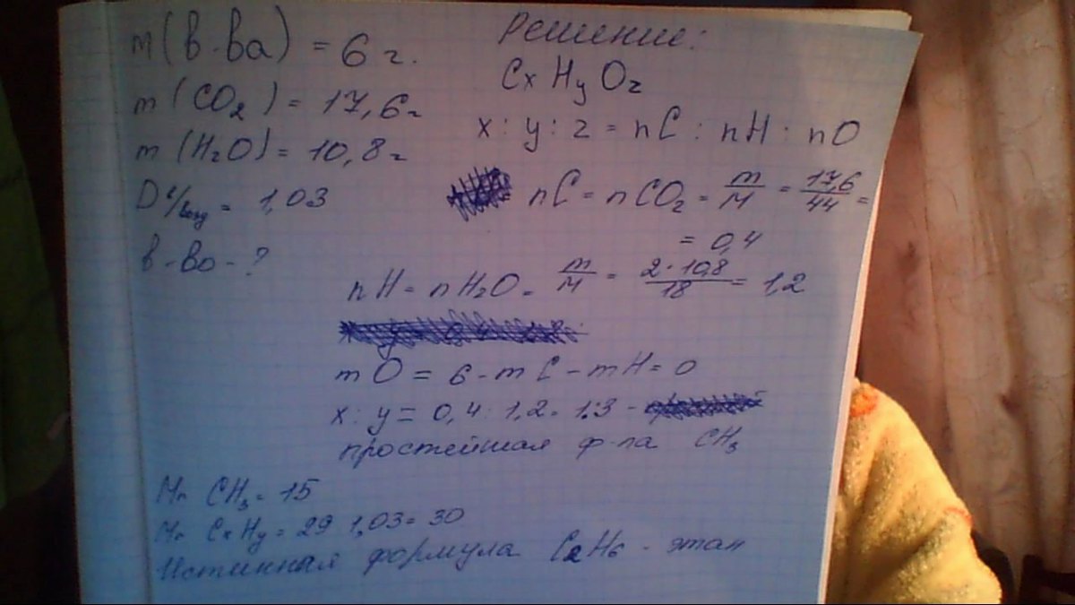 1. Решить задачу: При сгорании органического вещества массой 6,0 г образовалось 17,6 г углекислого газа и 10,8 г воды. Относительная плотность этого вещества по воздуху равна 1,03. Выведите молекулярную формулу данного вещества.