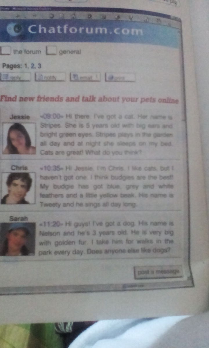 Привет,Джесси я-Крис.Я люблю котов,но у меня пока нет ни одного.Я думаю волнистые попугайчики самые лучшие!У моего волн.попугая голубые,серые и белые и маленький желтый клюв.Его зовут Твити и он поет целый день.