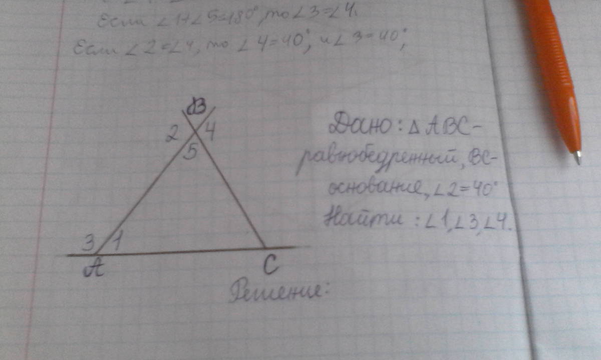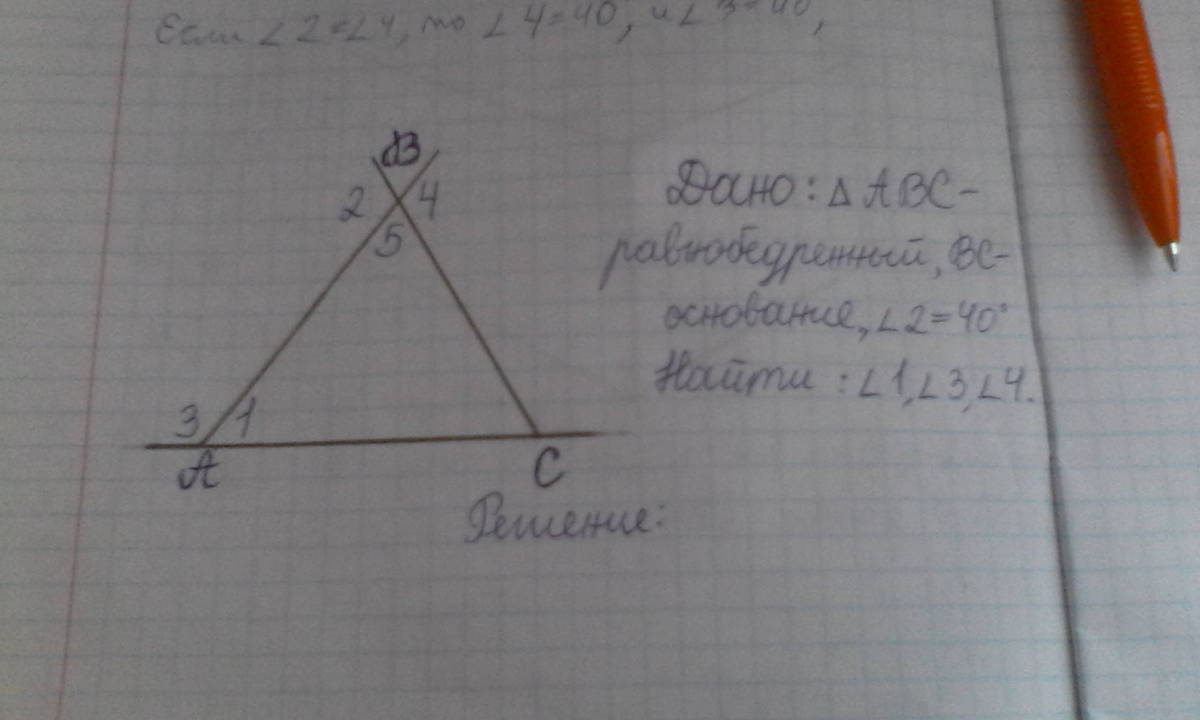Решите простую задачу на Углы ( внутренние односторонние, внутренние накрест лежащие, вертикальные, смежные ) Дано : треугольник ABC - равнобедренный, BC - основание, угол 2 равен 40 градусов. Найдите угол 1, угол 3, и угол 4. Рисунок представлен ниже.