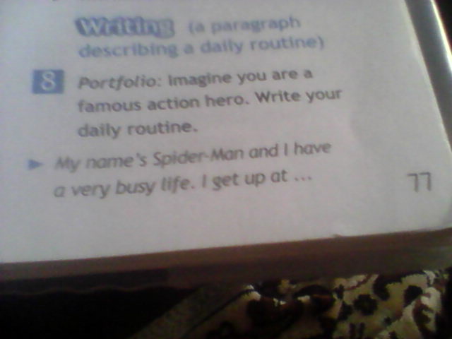 My name's Spider Man and I have a very busy life. I get up at 6 o'clock and have breakfast consisting of a ham sandwich and a glass of apple juice. Then I put on my formal suit and go to work where I spend about 4 hours taking pictures and writing articles about the latest news. After work I put on my costume and go on patrol to tackle crime. At 11 p.m I came back home, have a snack and go to bed.