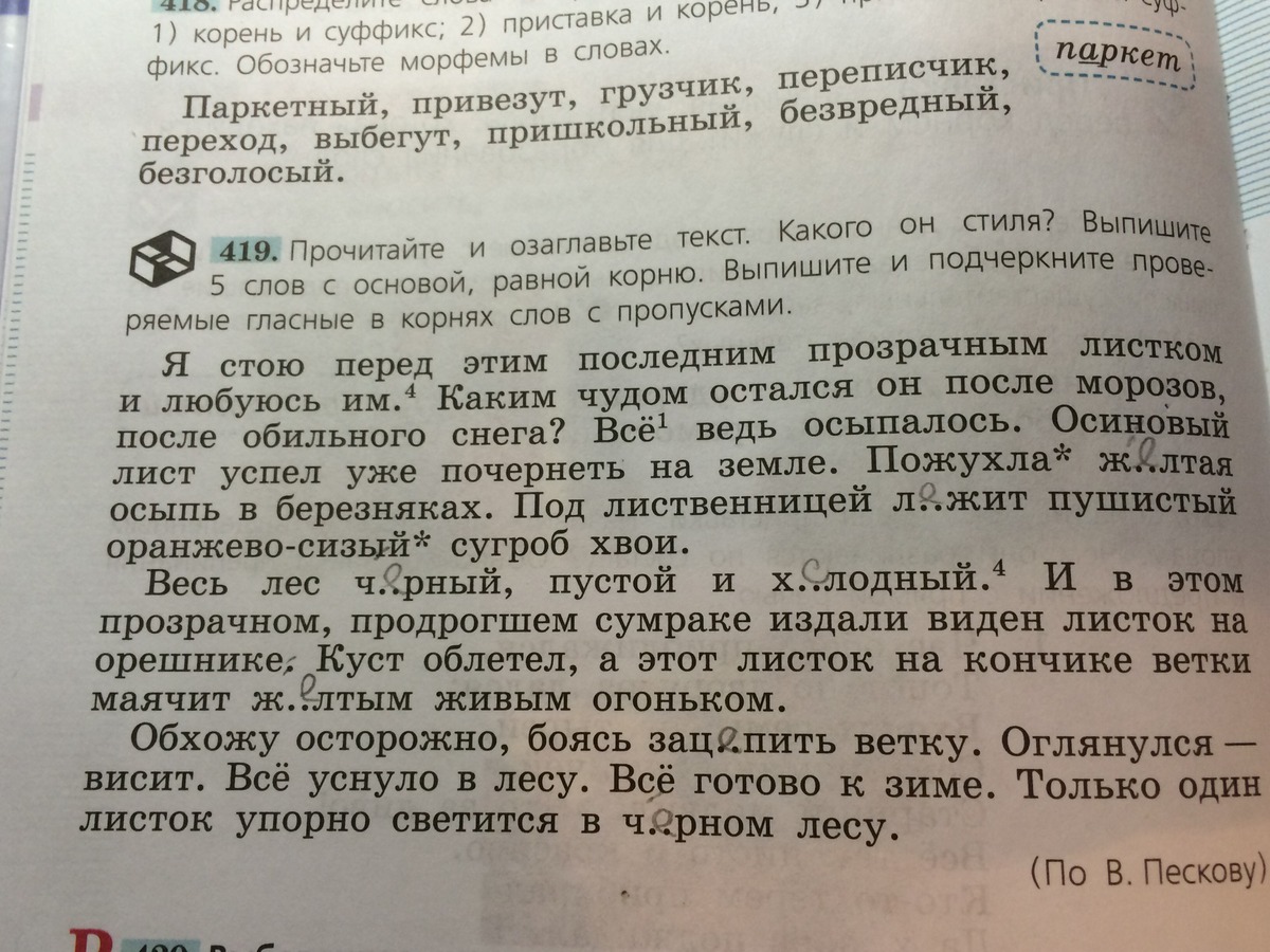 Прочитайте и озаглавьте текст . Какого он стиля ? Выпишете 5 слов с основой , равной корню . Выпишете и подчеркните проверяемые гласные в корнях слов с пропусками