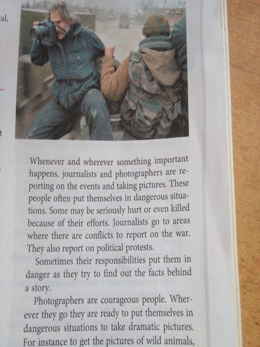 когда где-либо и когда-либо случается что-нибудь важное журналисты и фотографы сообщают об этом событии и делают фотографии. эти люди всегда ставят себя в опасные ситуации. некоторые из них могут быть серьёзно ранены или даже убиты за их достижения. журналисты отправляются на территории ,где идёт конфликты и рассказывают о войне.А также рассказывают о политических протестах.