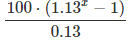 displaystyle frac{100(1.13^x-1)}{0.13}=y;  100(1.13^x-1)=0.13y;  1.13^x-1=0.0013y; \ 1.13^x=0.0013y+1;  xcdot ln(1.13)=ln(0.0013y+1); \ x= frac{ln(0.0013y+1)}{ln(1.13)}
