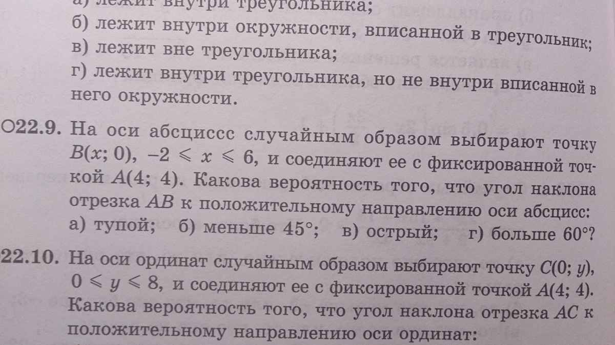Я,не уверен в вероятность,но надо рассматривать тангенс угла наклона прямой к положительному направлению ох.Если выбранная координата х точки принадлежит( острый tg=y/x =4/хменьше 1) от -2 до 4, вероятность этого события 1/6, то угол острый,если от 4 до 6, то угол тупой, вероятность этого события 1/10. Меньше 45 градусов ( tg=1=y/x=4/x, x=4)если х от -2 до 1, вероятность 1/3; больше 60 градусов ( tg 60= v3=y/x=4/x, x=4/v3=2,3)если х от 2,3 до 6, вероятность 1/8,3=10/83.