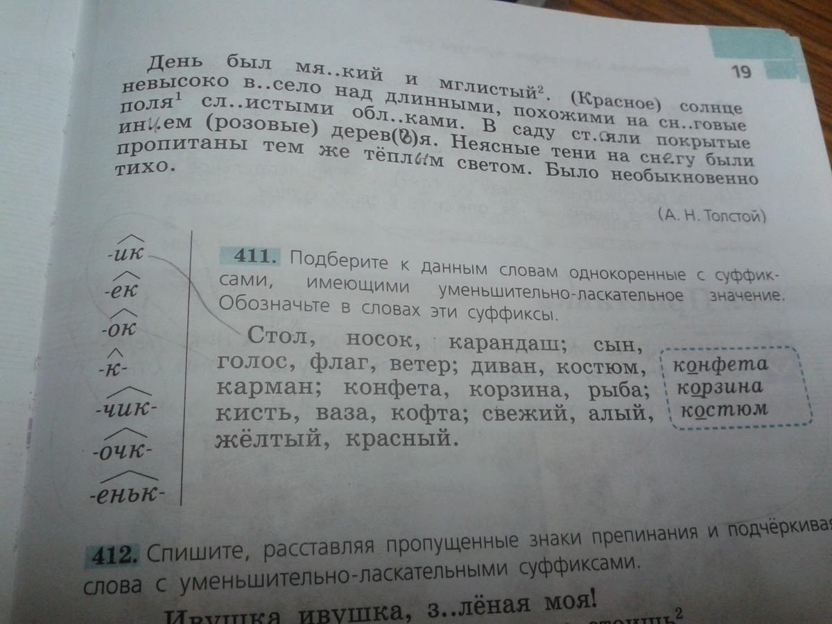 Столик, носочек, карандашик; сынок, голосок, флажок, ветерок; диванчик, костюмчик, карманчик; конфетка, корзинка, рыбка; кисточка, вазочка, кофточка; свеженький, аленький, желтенький, красненький.