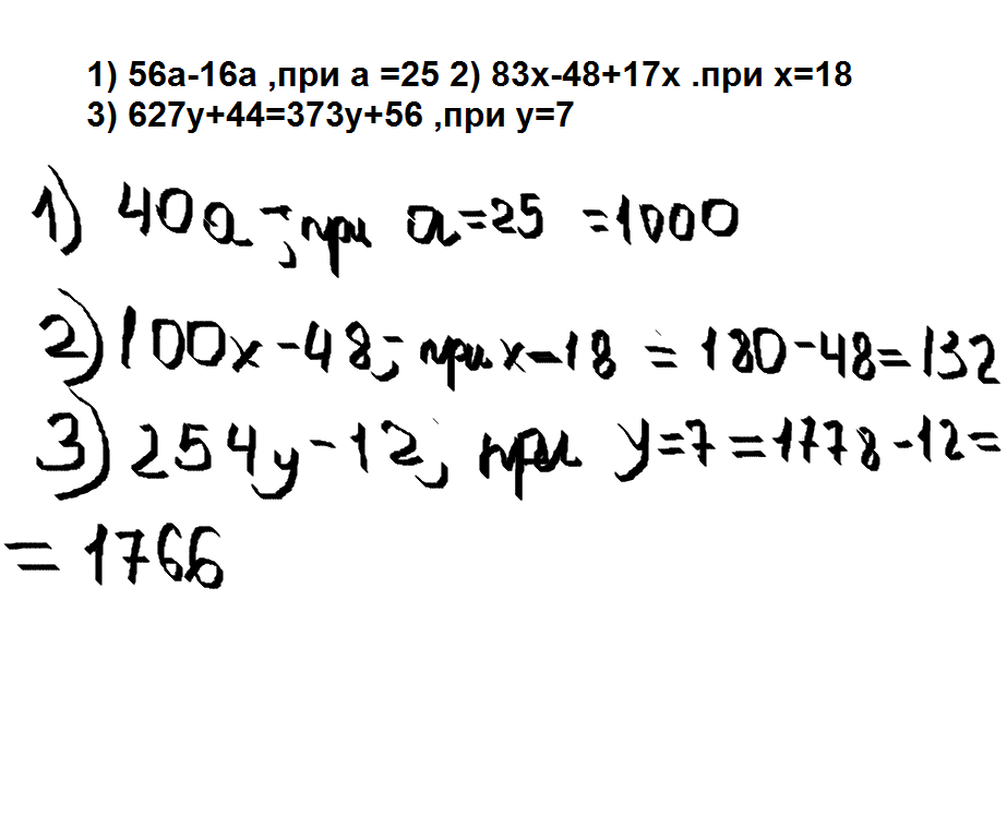 Упростите выражение и найдите его значение при указанных значениях буквы : 1) 56a-16a ,при a =25 2) 83x-48+17x .при x=18 3) 627y+44=373y+56 ,при y=7