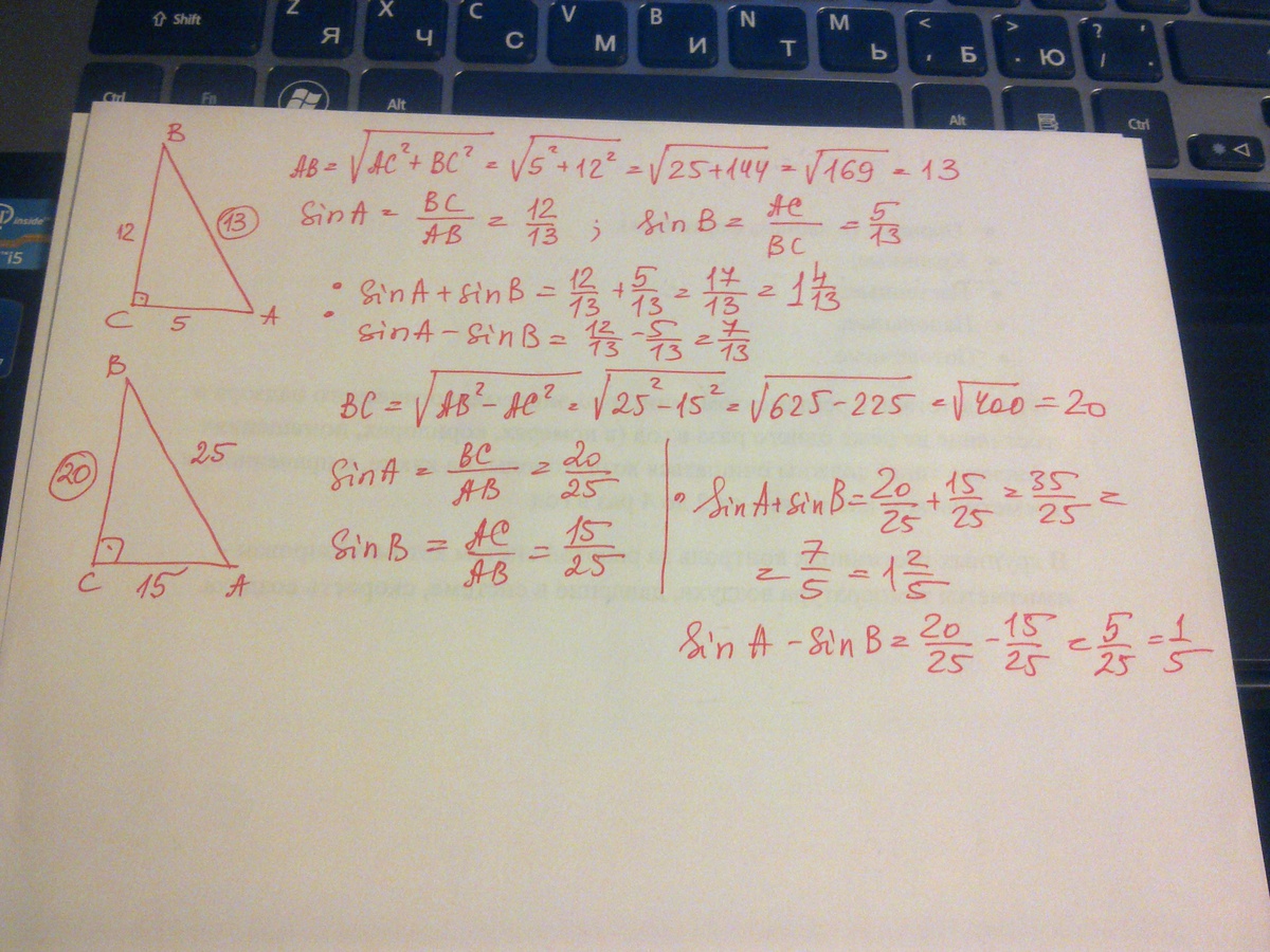 Найдите сумму и разницу синусов острых углов прямоугольного треугольника у которого