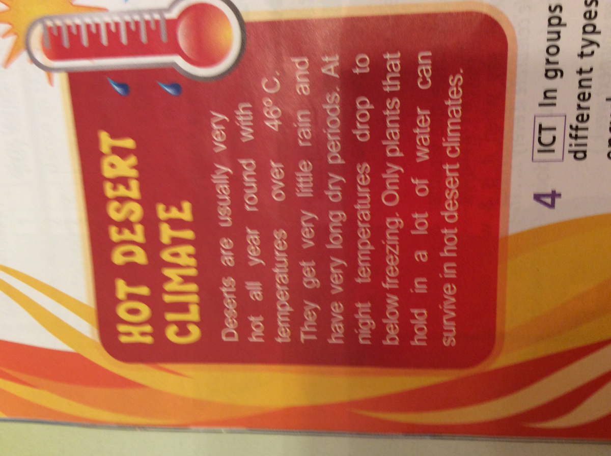 2)Пустыни, как правило, очень жарко круглый год с температурой свыше 46 ° C. Они получают очень мало дождей и имеют очень длинные сухие периоды. Ночью температура опускается ниже точки замерзания. Только растения, которые содержат в много воды может выжить в условиях жаркого климата пустыни.