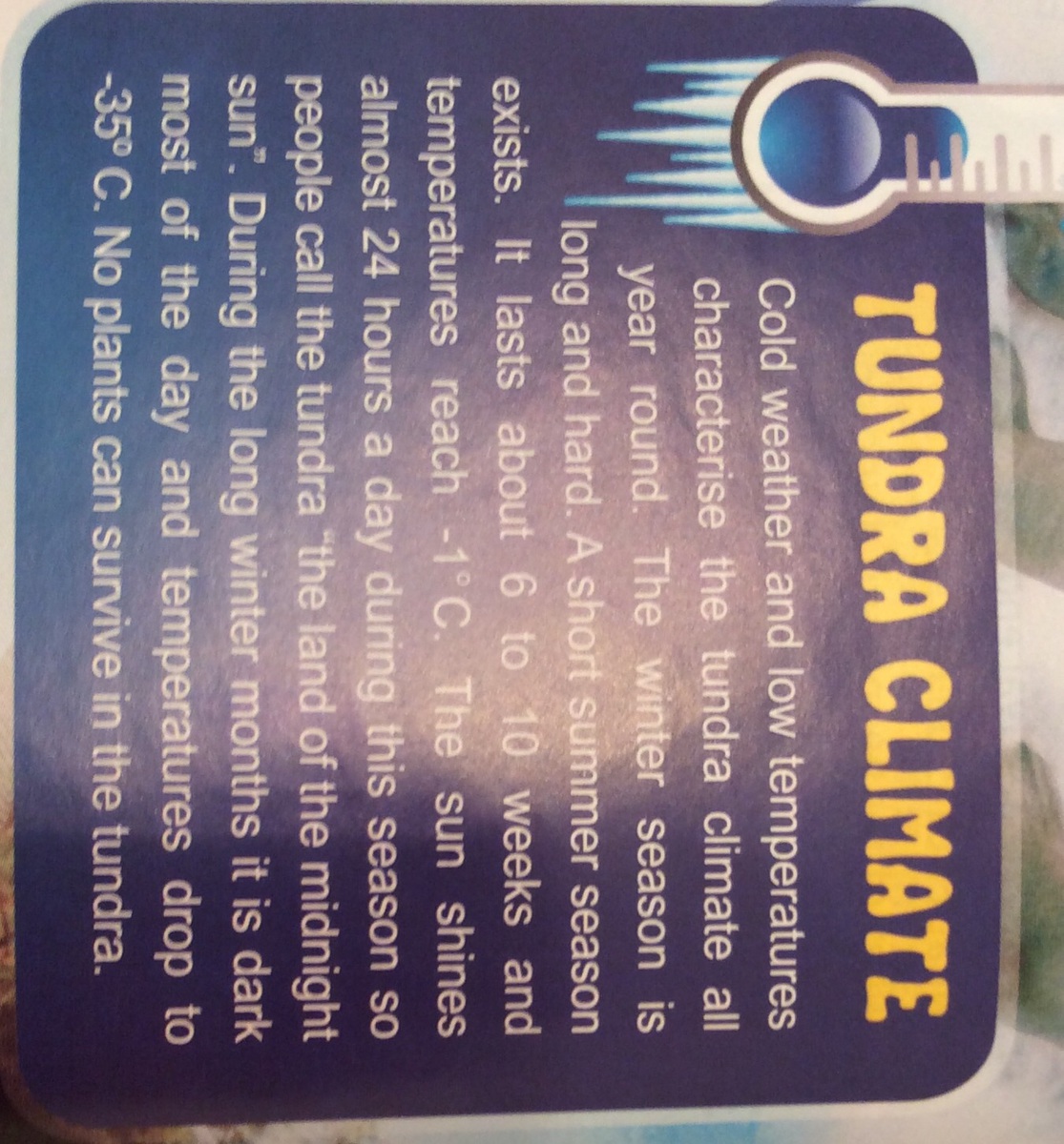1)Холодная погода и низкие температуры характеризуют тундры климат круглый год. Зимний сезон долго и упорно. Короче летний сезон существует. Она длится от 6 до 10 недель и температура достигает C. солнце светит почти 24 часа в сутки dunng этом сезоне так люди называют Тундра землю Полуночное солнце ". В течение долгих зимних месяцев в темное время суток большую часть дня и температура падает до -35 C. Нет растения могут выжить в тундре.