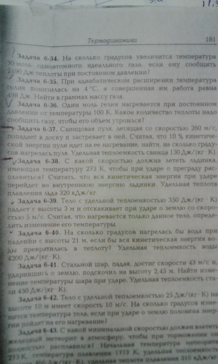 6,37. Дано:с=130 Дж /кг К,v=260 м/с,Q=0,1Eк.Найти дельта Т( далее Т); Ек=mv^2/2; Q=cmT, CmT =0,1 mv^2 /2; T=0,1 v^2 /2c= 0,1*260*260/(2*130)=26 градусов Кельвина