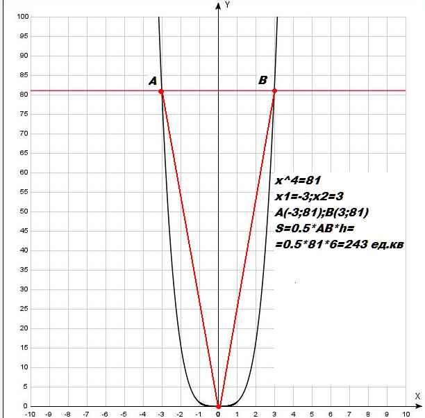Найдите площадь треугольника одной из вершин которого является начало координат, а две другие являются точками пересечения графика функции y=x^4 и прямой y=81.