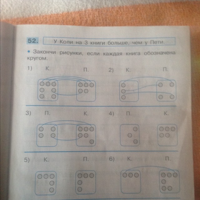Нужно соединить кружочки парами. Дорисовать столько кружочков, чтобы у К. было на 3 больше, чем у П.