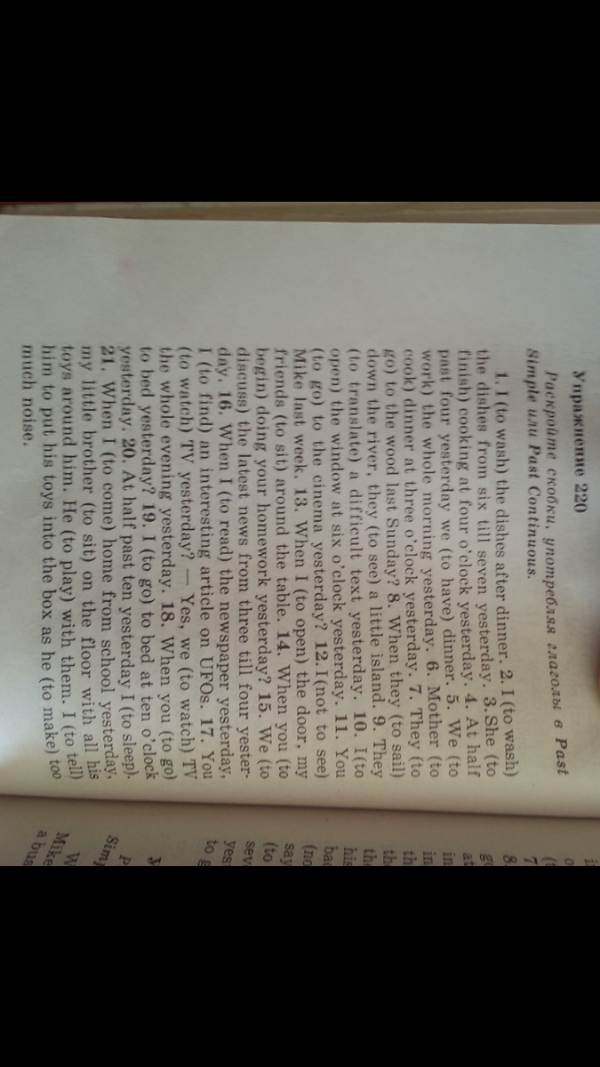 1. I washed. 2. I was washing. 3. She finished. 4. We were having. 5. We were working. 6. Mother was cooking. 7. Did they go. 8. They were sailing, they saw. 9. They translated. 10. I opened. 11. Did you go. 12. I did not see. 13. I opened, my friends were sitting. 14. When did you begin. 15. We were discussing. 16. I was reading, I found. 17. Did you watch, we were watching. 18. When did you go. 19. I went. 20. I was sleeping. 21. I came, my little brother was sitting, he was playing, I told, he was making.