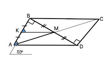 В параллелограмме ABCD угол А=60°, диагональ BD перпендикулярна к стороне АВ. Прямая, проходящая черкз середину отрезка - точку М - параллельно АD, пересекает сторону AB в точке К, МК=4см