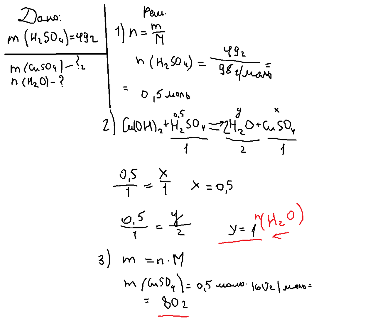 Определите массу соли и количество вещества воды, образовавшихся при реакции гидроксида меди с серной кислотой массой 49 грамм.