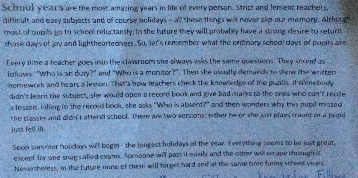 Школьные годы самые восхитительные годы в жизни каждого человека. Строгие и мягкие учителя, трудные и легкие предметы и, конечно же, каникулы - все это никогда не забудется. Хотя большинство учеников ходят в школу с неохотой, в будущем они, наверняка, захотят вернуть те дни радости и беззаботности. Итак, давайте освежим в памяти обычные школьные будни учеников.