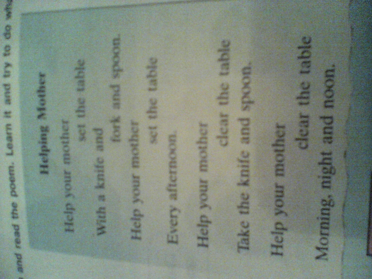 Хелпинг мазер,хелп йо мазер,сед зе тэйбл,эврии афтимун,,хэлп йо мазёр.клин зе тэйбл,тэйк зе найф,энд спун,хэлп йо мазер,клин зе тэйбл,монинг,найт енд нун,сорри что так написала,поставь плиз лучший