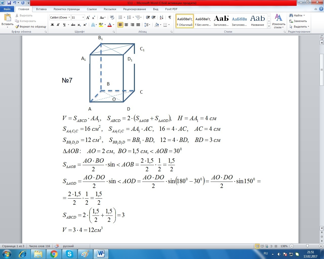 7. Основание прямой призмы – параллелограмм, диагонали которого пересекаются под углом 30˚. Найдите объём призмы, если площади его диагональных сечений равны 16 см2 и 12 см2, а высота – 4 см.