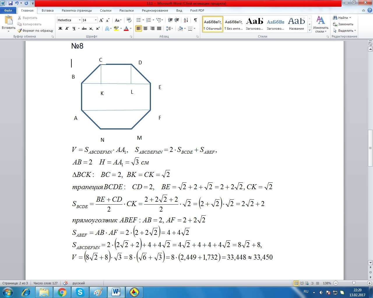 8. Вычислите с точностью до 0,001 объём правильной восьмиугольной призмы со стороной основания, равной 2, и высотой, равной √3.